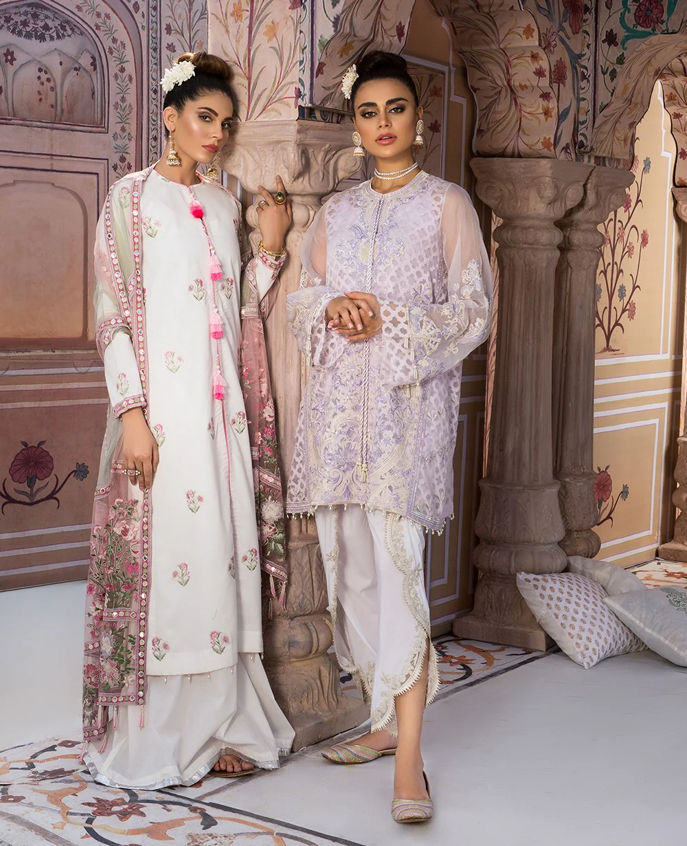 It is a summer cool lilac swing shirt. The fabric used is dyed jacquard which is composed with tilla embroidery and consists of pearl detailings. It is paired with a chata pati net duppata with hand made tassels on the pallu. Slip is also included.