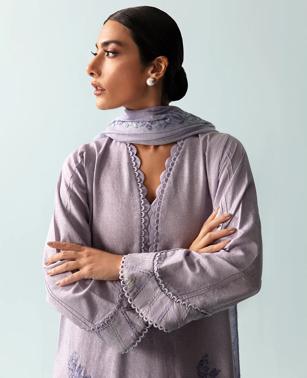 A harmonious blend of delicate shades on this three piece stitched ensemble creates an aura of effortless sophistication that is sure to turn heads. Bewitched by a contrasting dupatta, adorned with a captivating two-toned palette and an opulent embroidered border that epitomizes refined elegance. The sleeves are thoughtfully designed with intricate pin tucks and delicate lace details, elevate the ensemble to new heights of sartorial splendor. Immerse yourself in the everyday glamour of this exquisite creation, exuding an air of timeless grace and charm. Embrace the understated opulence and revel in the beauty of this enchanting masterpiece.
