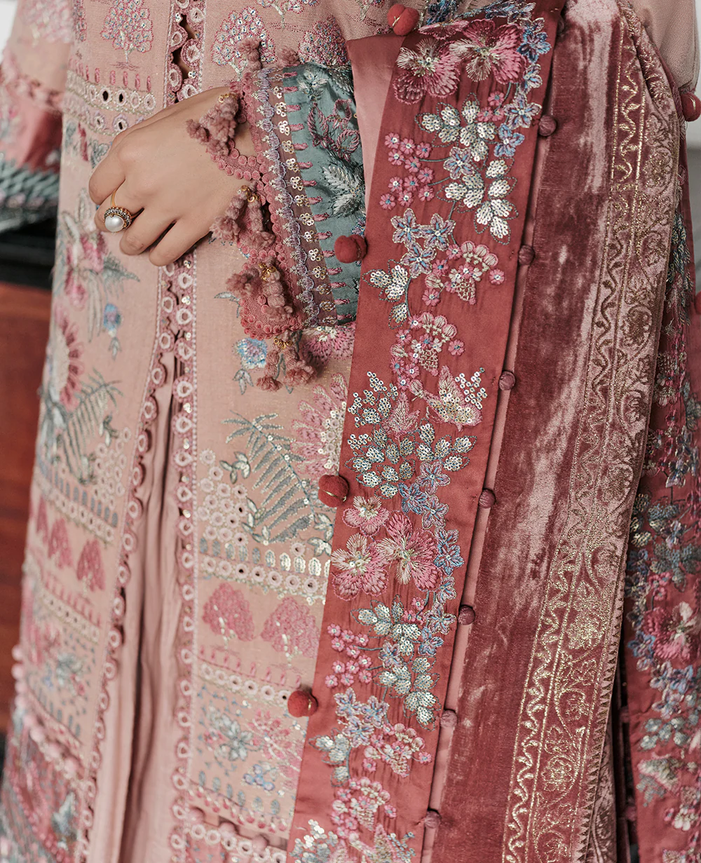 A pink karandi with rose gold zari canvas is a two panelled ankle length jacket that is beautifully composed in floral bunches, leaves and swirling wines.
