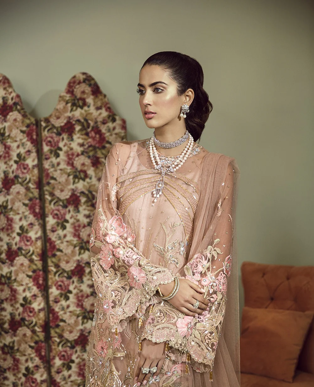 High-low cut-line peach net shirt with heavy embellished paired with dupatta and embroidered pants.