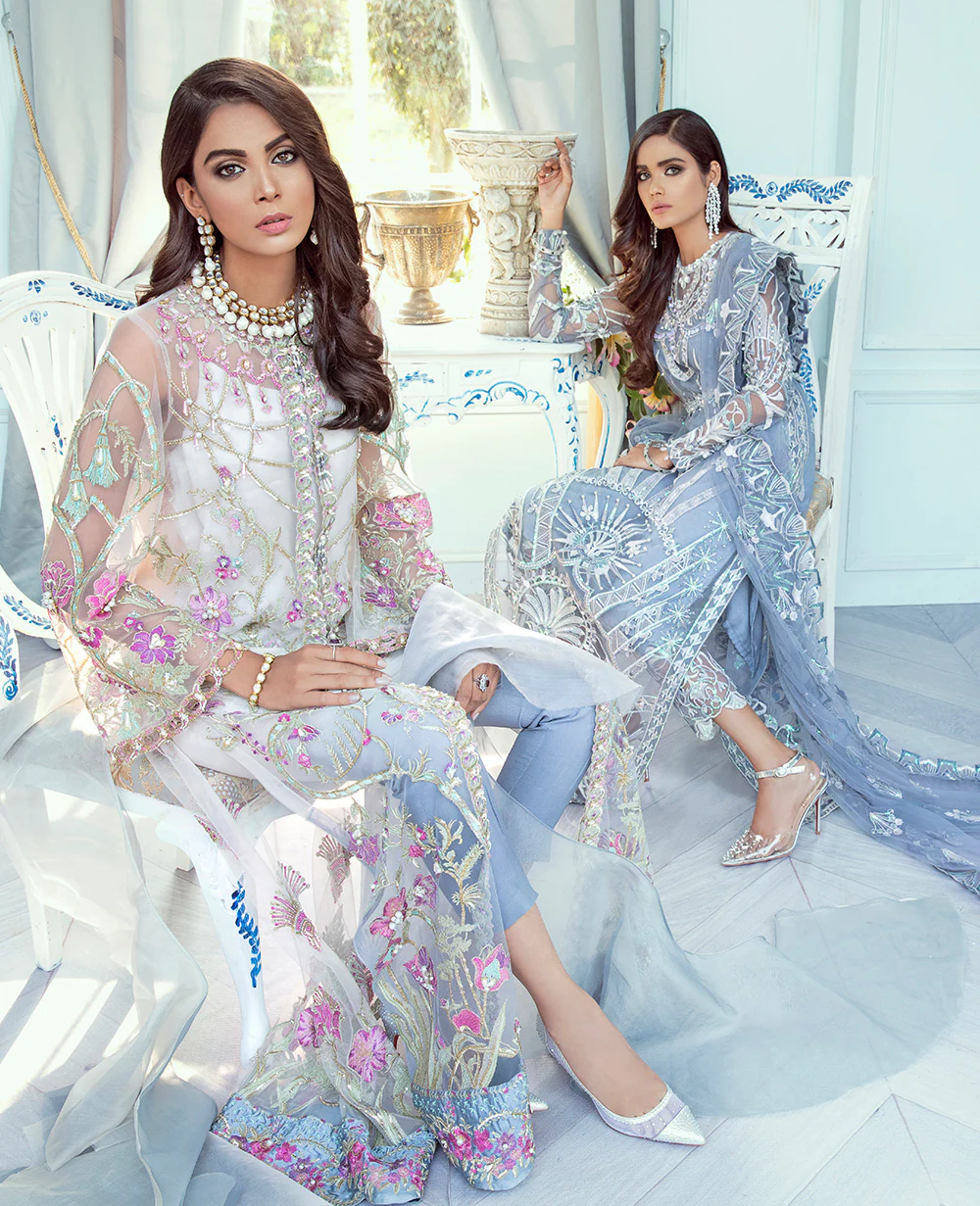 Ombre' An ethereal ivory white and pale blue ombre dyed long front open jacket hand worked and embroidered paired with a regal statement ruffled dupata and ombre dyed silk pants.