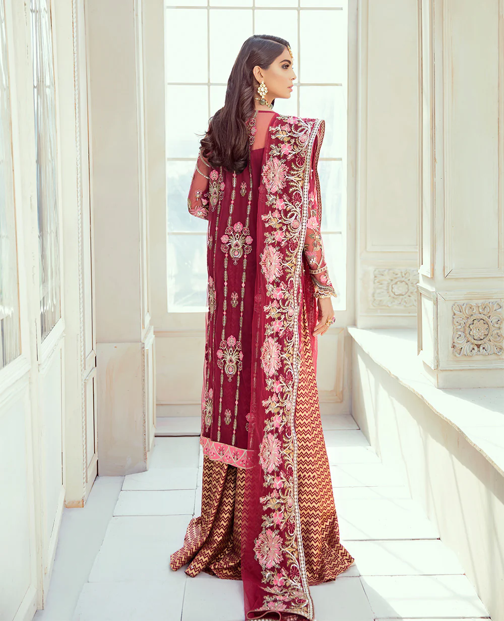 Fleur' rendered in a deep burgundy red with shades of peach scattered with hand embellishments paired with a gold dust printed sharara and heavily embroidered dupatta.