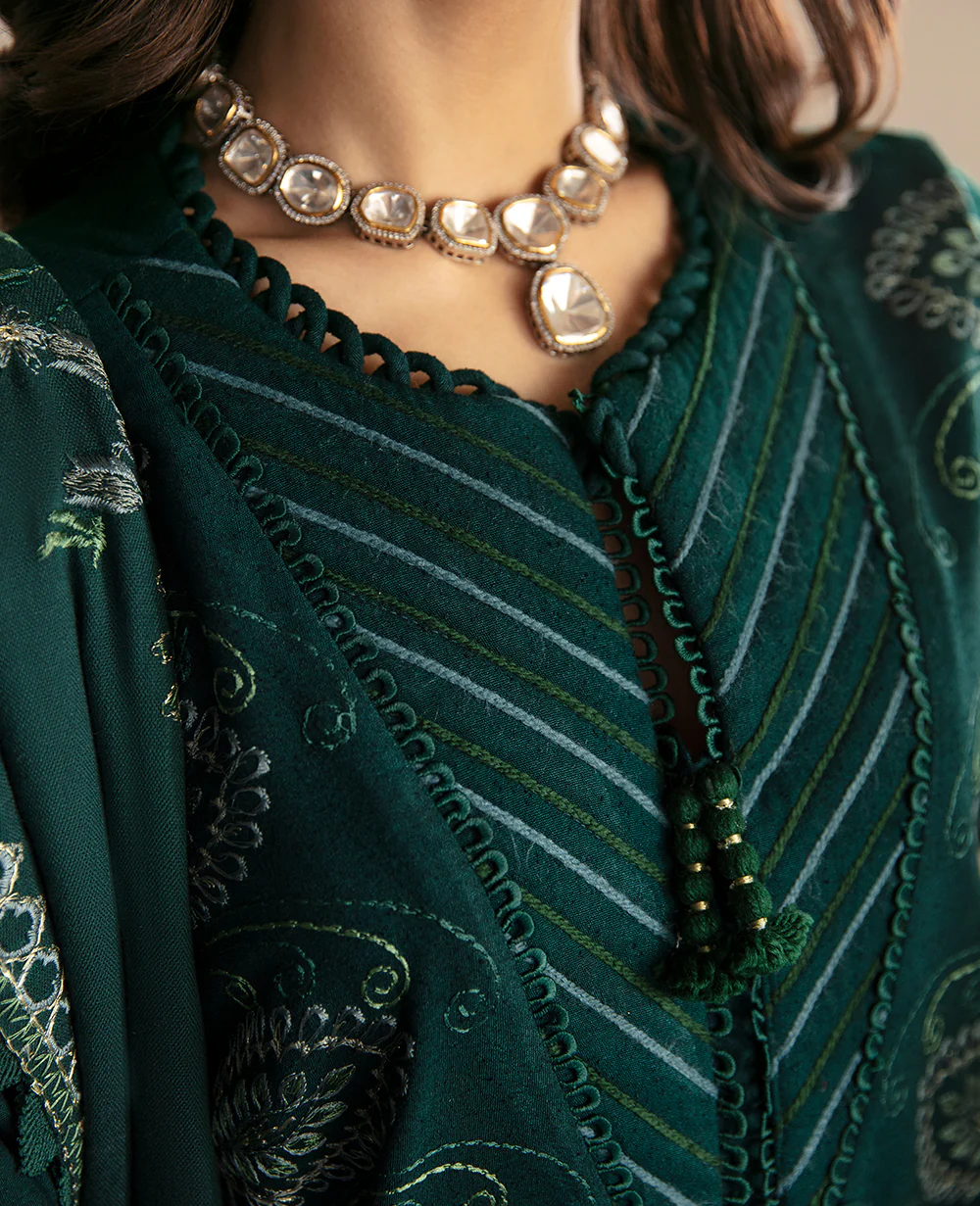 Indulge in the allure of the natural world with this breathtaking green ensemble. Meticulously fashioned from opulent karandi fabric, it boasts intricate floral details, culminating in a captivating deep V neckline. The attire is bedecked with striking floral vines and elegantly rendered botanical motifs in mesmerizing shades of monochrome. Elevate your ensemble with the addition of an acrylic shawl, lavishly adorned with exquisite embroidered boxes along the hem and a gracefully embroidered border on all sides. Embrace the profound beauty of nature, meticulously interwoven into every meticulously crafted stitch.