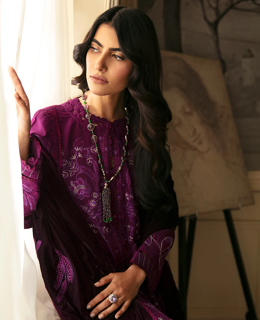 Unfold into a realm of sophistication with our magnificent Magenta Khaddar center-embroidered two-panel open shirt. This piece serves as a picturesque canvas adorned with an intricate array of floral bunches, delicate leaves, meandering vines, and a shikargah-embroidered hem, all rendered in a captivating palette of pinks, lilac, and plum. Allow the ethereal beauty of nature to become an integral part of your attire.