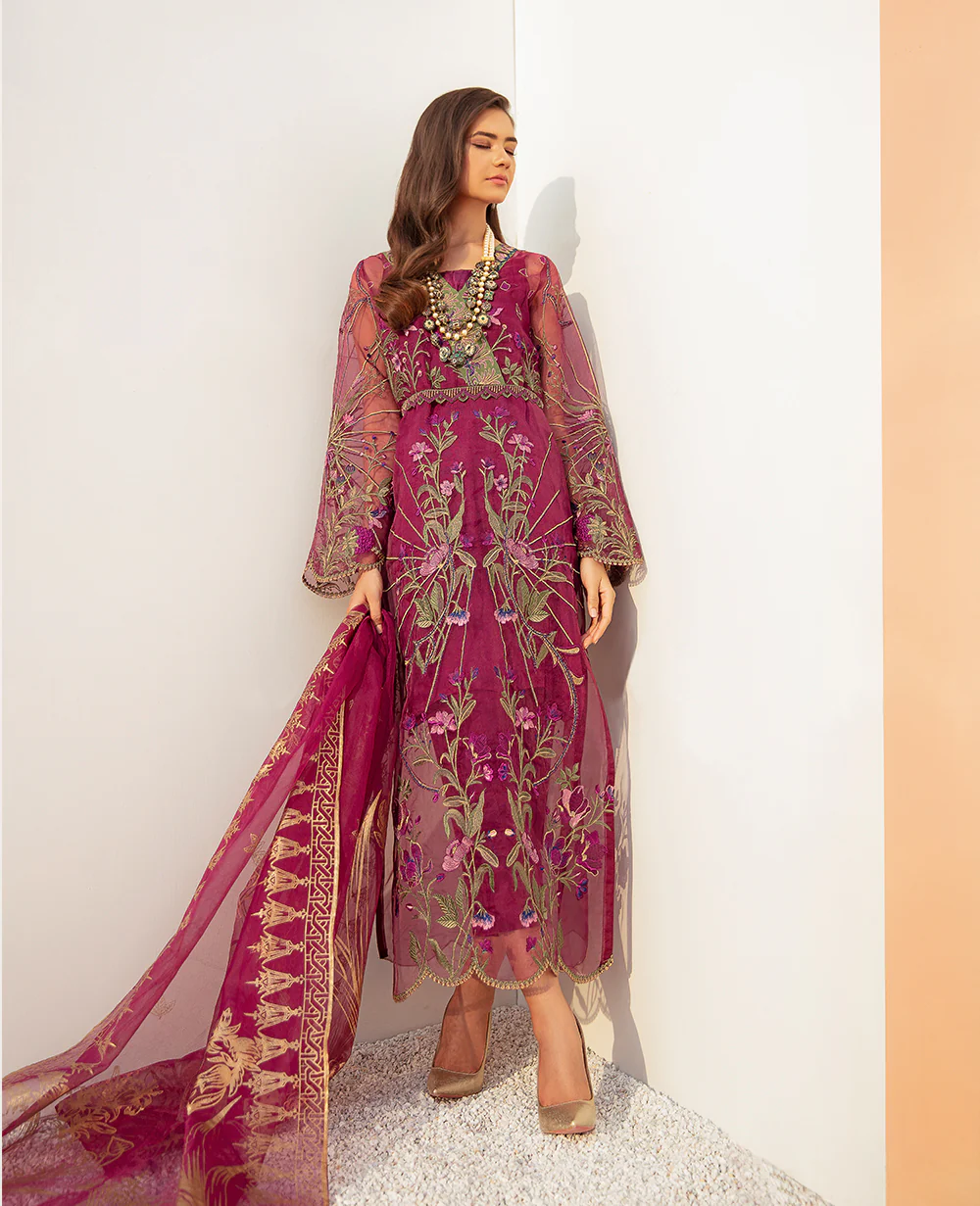 Turn heads this season in the long tulle ‘Purple potion’. Bell sleeves and an addition of belt is pouring an elegant touch to the garment. The shirt is paired with gold dust printed organza dupatta and straight pleated trouser.