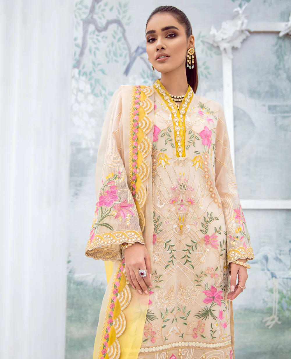 This stunning cream-colored zaree net shirt with an accent of prime rose yellow and hints of pink encrusted with gotta pani on front and sleeves. Enhanced with gotta detail on the hem of fitted pants. Perfectly paired with a dip-dyed embroidered dupatta.